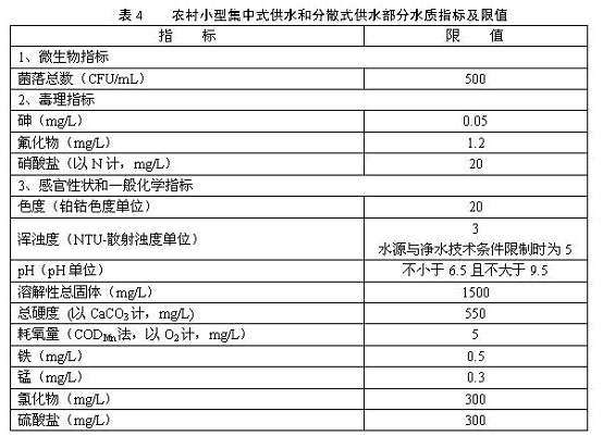 4.1.7 農(nóng)村小型集中式供水和分散式供水的水質(zhì)因條件限制,部分指標(biāo)可暫按照表4執(zhí)行,其余指標(biāo)仍按表1、表2和表3執(zhí)行。